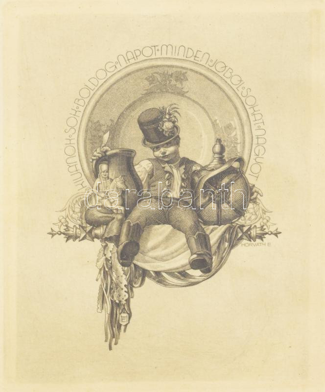 Horváth Endre (1896-1954): Kívánok sok boldog napot, minden jóból soka... https://www.darabanth.com/de/472-Fernauktion/472.0/Gemalde-und-Grafiken/Ex-libris-Kleingrafik~1000003/Horvath-Endre-1896-1954-Kivanok-sok-boldog-napot-minden-jobol-sokat-nagyot-Rezkarc-papi~II3198386