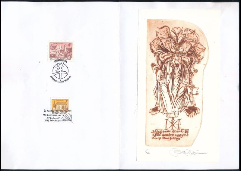 Horváth Hermina (?- ): ,,A király nem zsarnok, a Föld minden magyaré, a nép nem szolga". Hidegtű, papír, jelzett, halmozott grafika (bélyeg, alkalmi bélyegzés, grafika), grafika méret: 16x7,5 cm