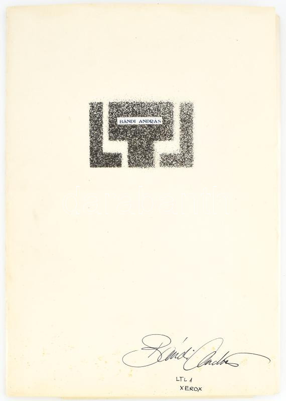 Bándi András (1952-): LTL (6 db sokszorosított grafika). Xerox (fénymásolat), papír, mindegyik jelzett és számozott. Kiadói, jelzett papír mappában. Mappa belső hajtókáján és egyik lap tetején néhány kevés apró folttal. Lapméret: 31x21,5 cm.