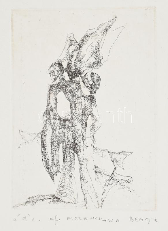 Beschreibung: Bencsik János (1945-): Melancholia. Rézkarc, merített papír, jelzett, művészpéldány é d' a. jelzéssel. 17x12 cm