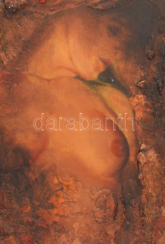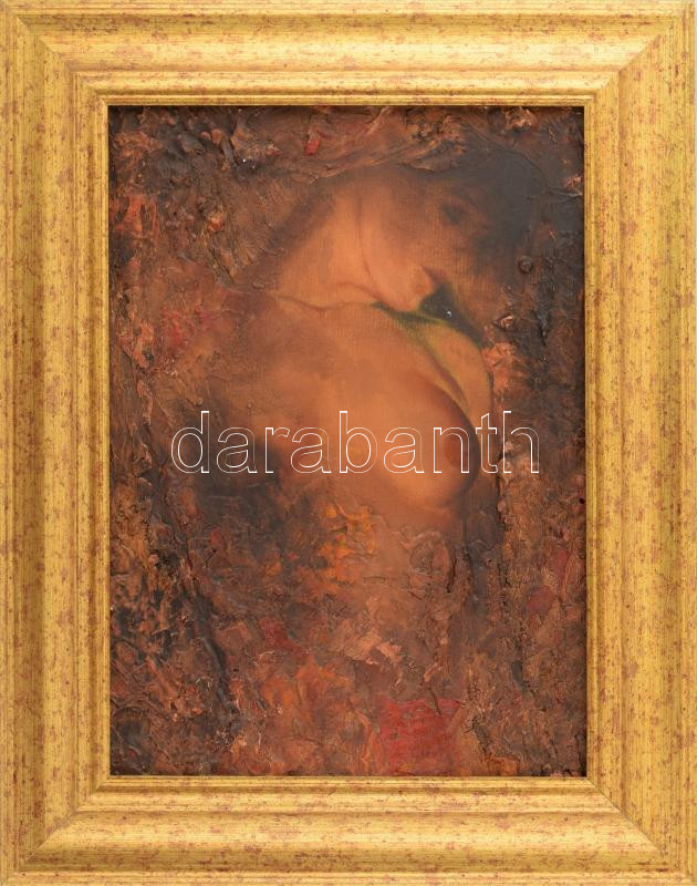 Burkus József (1957-): Érints meg (női akt). Olaj, farost. Jelzés nélkül. Hátoldalán autográf felirattal és címkén feliratozott. Dekoratív fakeretben. 40,5x29,5 cm