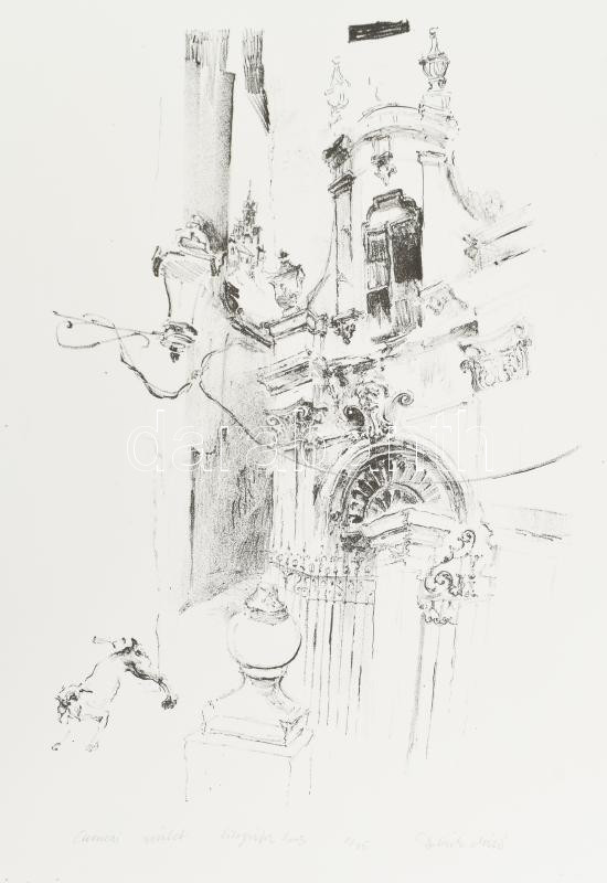 Beschreibung: Dobesch Máté (1978-): Cuencai részlet, 2003. Litográfia, papír, jelzett, 2/35 számozással. 35x24 cm (sarkán kis törés)