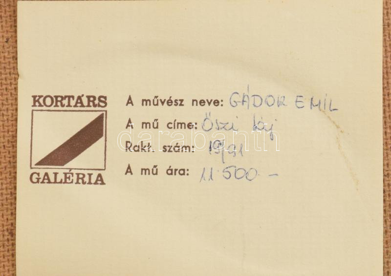 Gádor Emil (1911-1998): Őszi táj. Olaj, farost, jelezve balra lent. Fa... https://www.darabanth.com/de/472-Fernauktion/472.0/Gemalde-und-Grafiken/Gemalde-und-Grafiken~1000001/Gador-Emil-1911-1998-Oszi-taj-Olaj-farost-jelezve-balra-lent-Fakeretben-30C39739-5-cm~II3196731