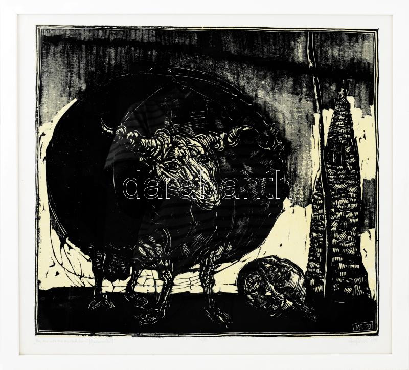 Beschreibung: König (Kőnig) Róbert (1951-2014): The ewe with the hooked horn. Linómetszet, papír, jelzett, számozott (II./V.) üvegezett keretben, 38,5x41,5 cm