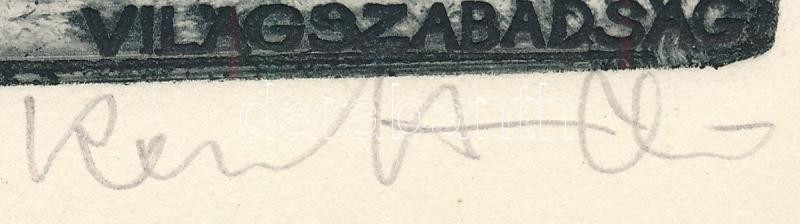 Beschreibung: Konstantin László (1930-): Világszabadság. Rézkarc, papír. Jelzett. 19,5x29 cm