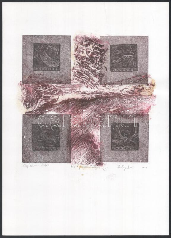Beschreibung: Szalay Miklós (1972-): Mysterium fidei, 2001. Papírmetszet, prespán, vegyes technika, papír, jelzett, 4/5 számozással. 20x21 cm