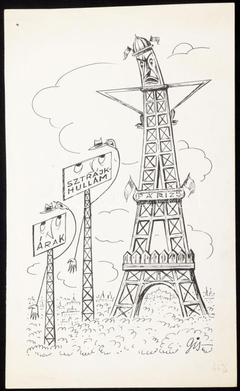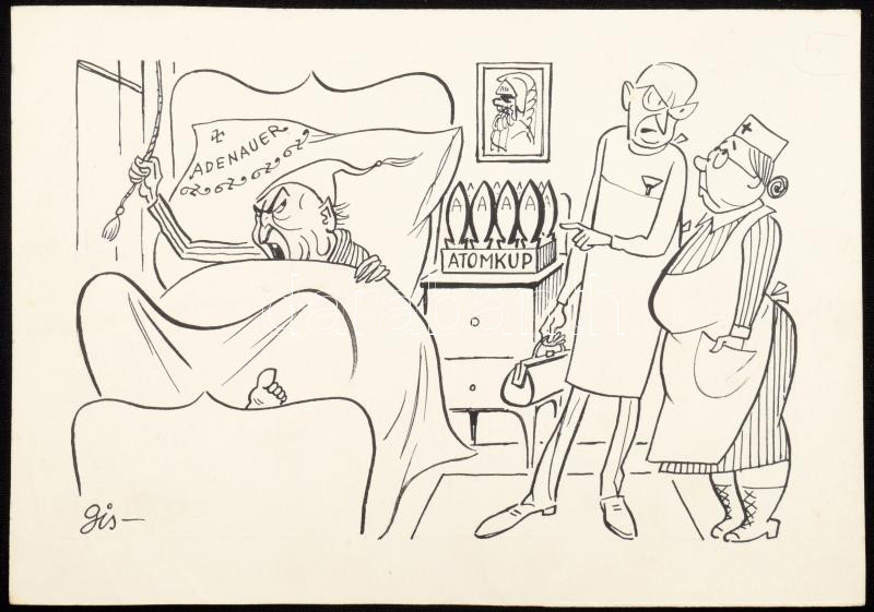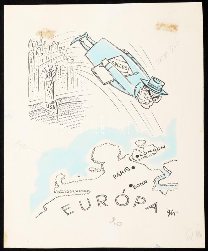 Szegő Gizi (1902-1985): 3 db politikai karikatúra, 1950-60 körül. Vegyes technika, papír, jelzett. Hátoldalán "Ludas Matyi" (2 db) és "Ellátó Szerkesztőség" (1 db) bélyegzővel. 15x21,5 és 26x15,5 cm közötti méretekben.