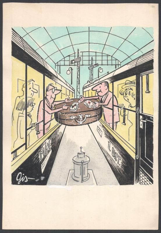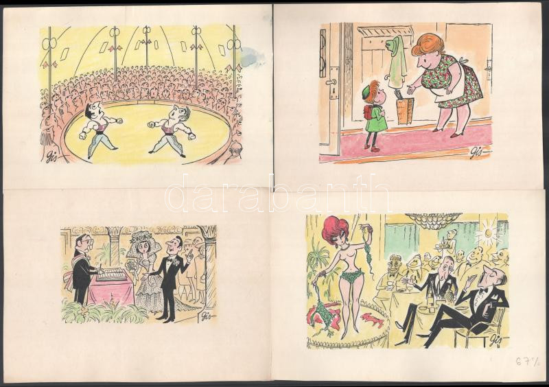 Szegő Gizi (1902-1985): Karikatúrák vázlatai, 9 db (közte egy erotikus). Vegyes technika, papír, mind jelzett. Mindegyik hátoldalán "Ludas Matyi Szerkesztősége", "Kis Ludas" v. "Műsor BUÉK" bélyegzővel. 15x21,5 cm