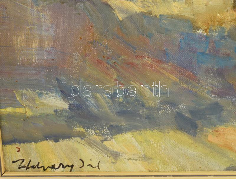 Beschreibung: Udvary Pál (1900-1987): Balatonfüred 40 éve. Olaj, vászon. Jelezve balra lent. Hátoldalán autográf felirattal és Képcsarnok Vállalat címkéjével. Fakeretben. 60x80 cm