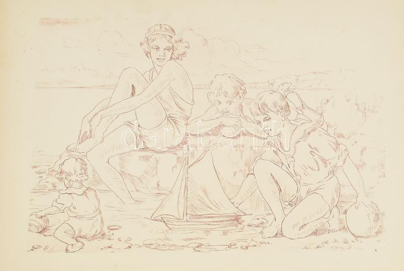 Jelzés nélkül: Strandon játék vitorlással. Litográfia, papír. Lapszéli apró szakadással. 33x48 cm.