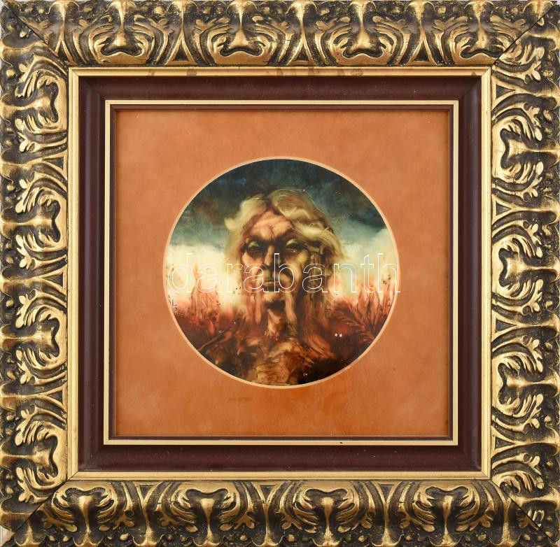 Jelzés nélkül: Szürrealista férfi portré. Olaj, műanyag lemez. Dekoratív, üvegezett, sarkaiban kissé sérült fakeretben, d: 21 cm