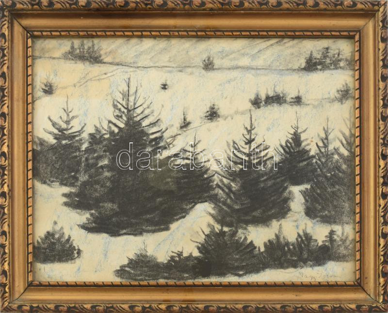 Nagy István jelzéssel: Dombos táj. Vegyes technika, papír. Hátoldalán Magyar Nemzeti Galéria 1252/977 sz. bírálati címkéjével. Üvegezett fakeretben. 22x30 cm
