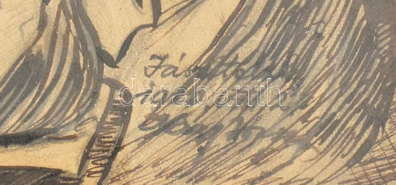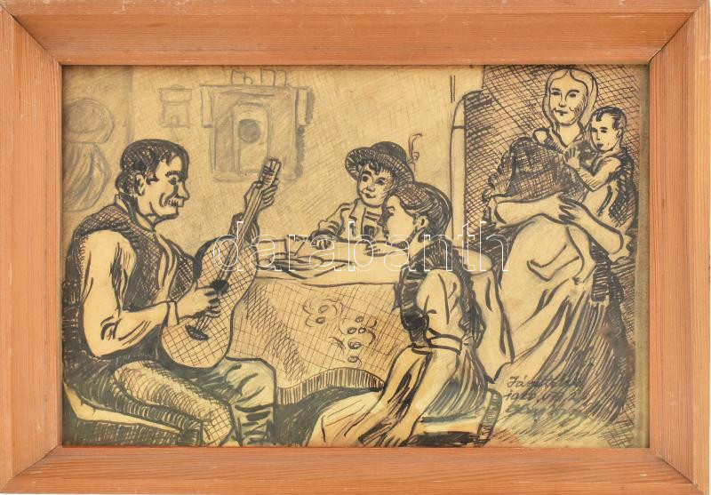 Nagy János jelzéssel: Zenélő társaság Jászapátiban. Ceruza, tus, papír. Üvegezett fakeretben. 16x22,5 cm.