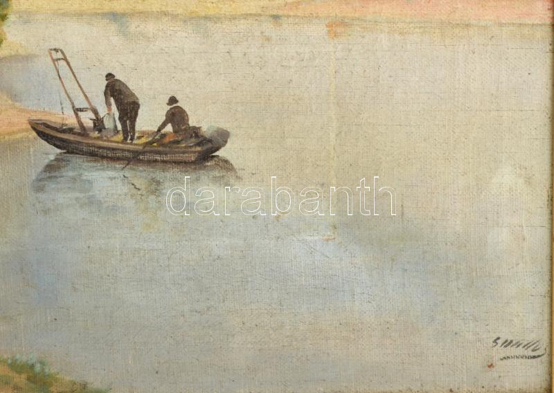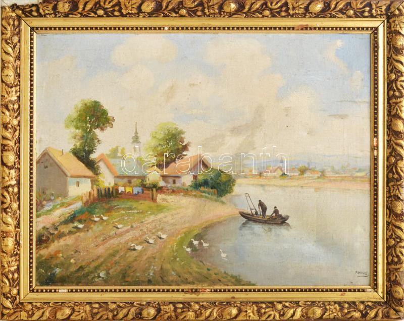 Olvashatatlan jelzéssel: Élet a parton. Olaj, vászon, kissé sérült. Dekoratív, sérült fakeretben. 50x66 cm
