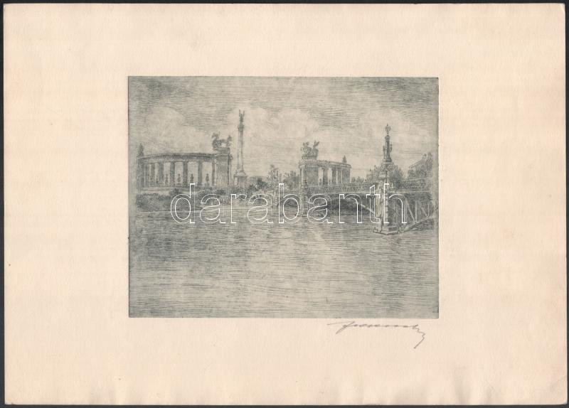 Beschreibung: Olvashatatlan jelzéssel: Hősök tere, Városligeti-tó a Zielinski híddal. Rézkarc, papír, 15x19 cm