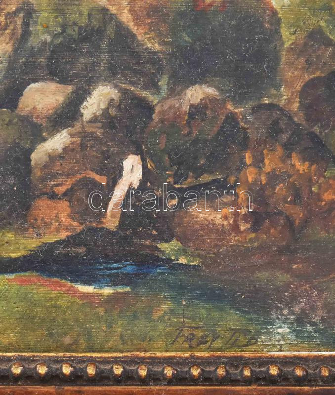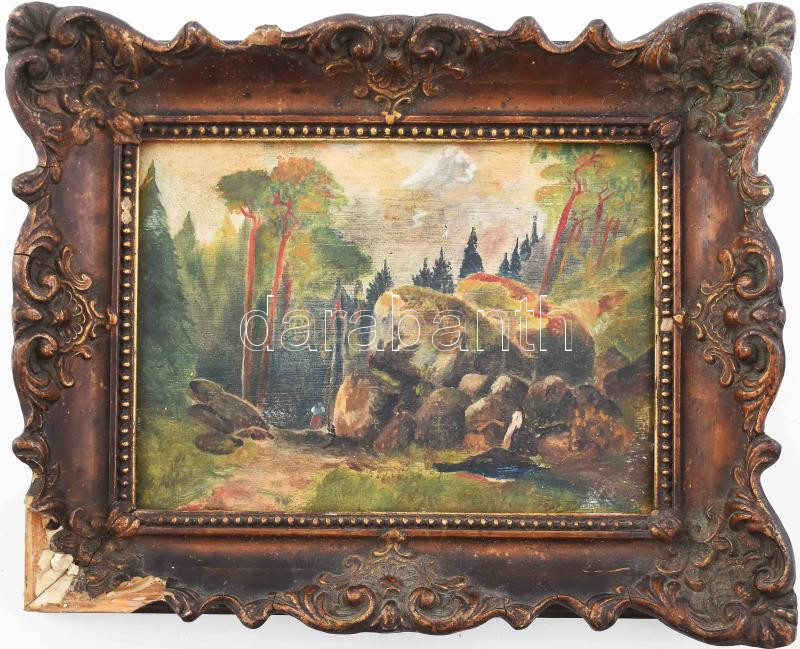 Beschreibung: Olvashatatlan jelzéssel: Sziklás táj, olaj, karton. Dekoratív, sérült fakeretben, 16×22,5 cm
