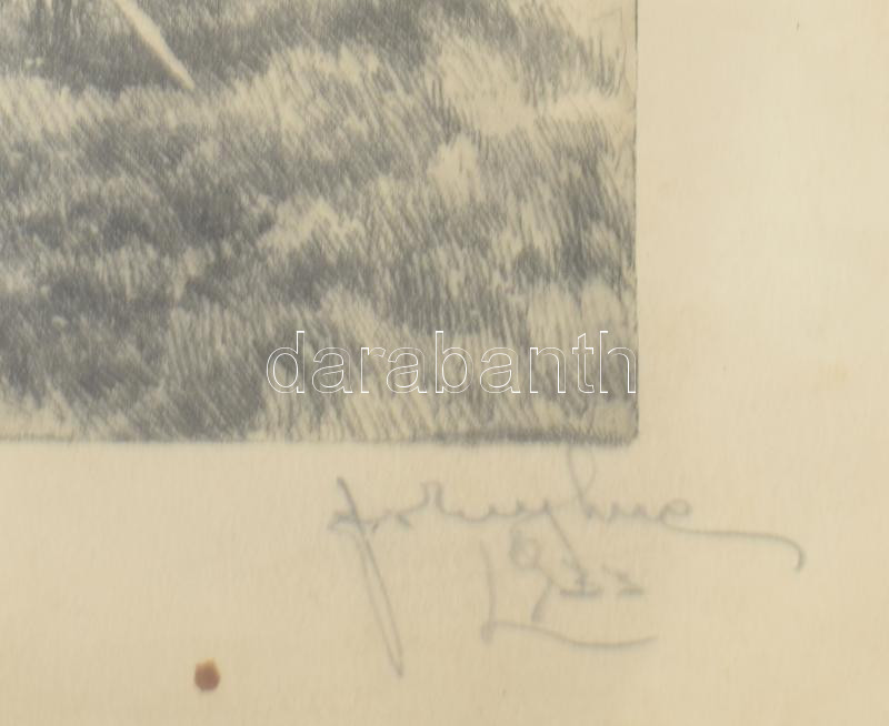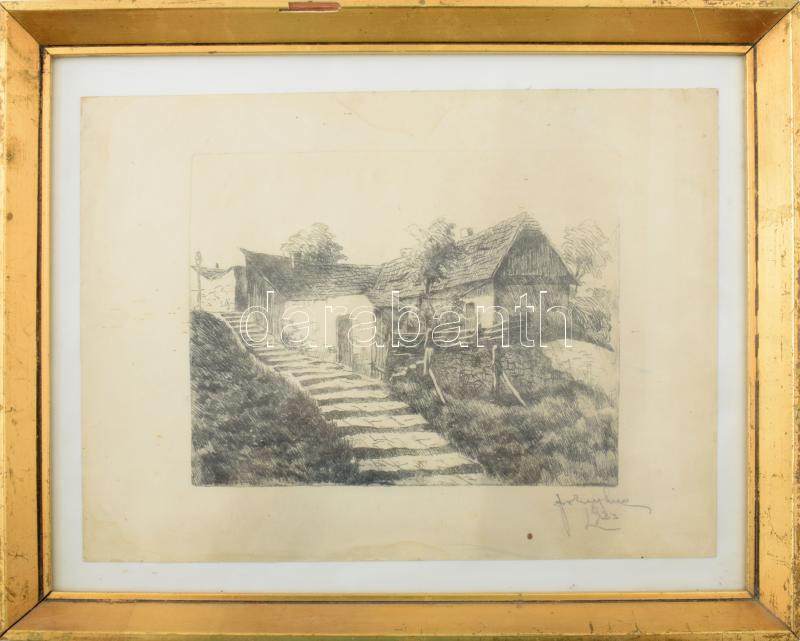 Olvashatatlan jelzéssel: Utcarészlet lépcsővel (Tabán?), 1933. Rézkarc, papír, jelzett, üvegezett fakeretben, lapszéli ázásnyomokkal, 16,5x21 cm