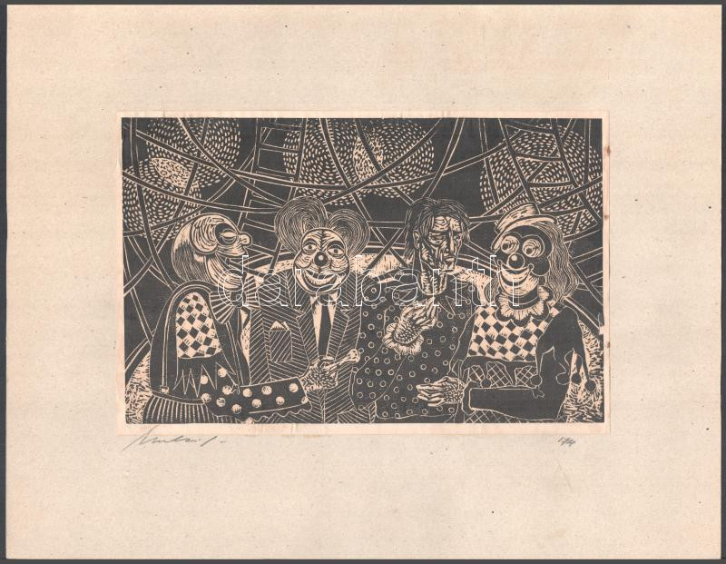 Beschreibung: Olvashatatlan jelzéssel (erdélyi magyar művész?): Bohócok, 1974. Linómetszet, papír, kartonra kasírozva, 16,5×25,5 cm.