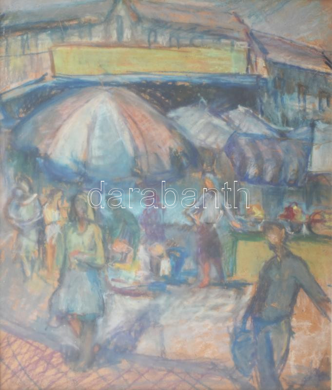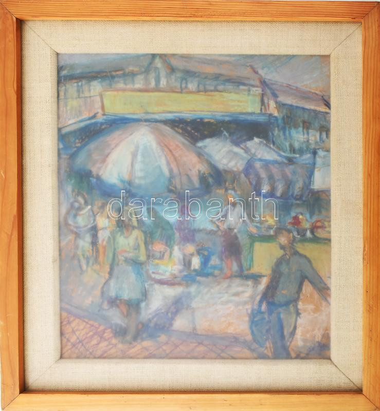 Olvashatatlan jelzéssel (?) jobbra lent, XX. sz második fele: Piaci jelenet. pasztell, farost. Üvegezett fakeretben. 33x28 cm.