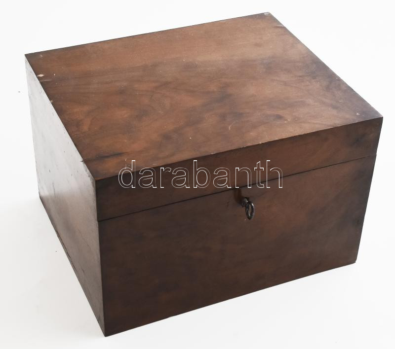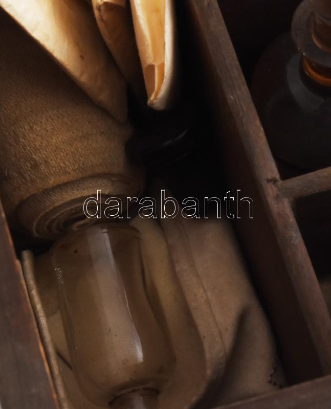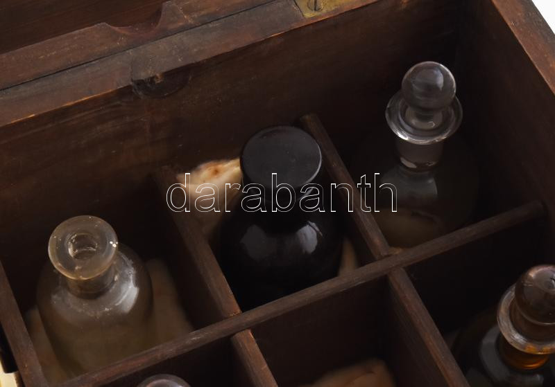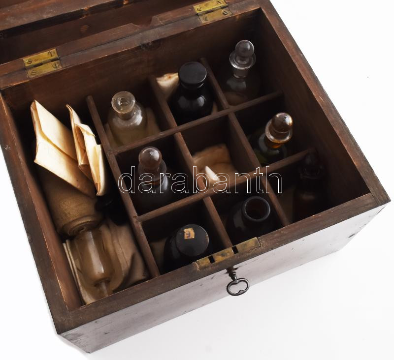 Antik gyógyszerész ládika. Gyógyszeres üvegcsékkel, csiszolt üvegdugóval, feliratos. XIX. sz vége. Políturozott fa ládikában, kulcsa is megvan. 28x23x18 cm