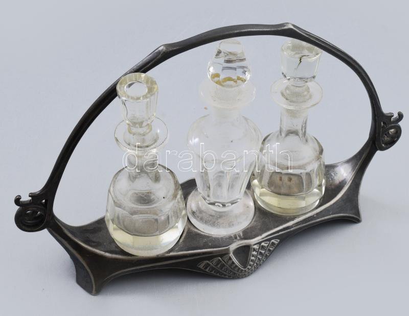 Beschreibung: Szecessziós parfümtartó szett, 3 db nem hozzáillő csiszolt dugós üveg tégely, ezüstözött tartón, jelzés nélkül, kopással, 23x14 cm