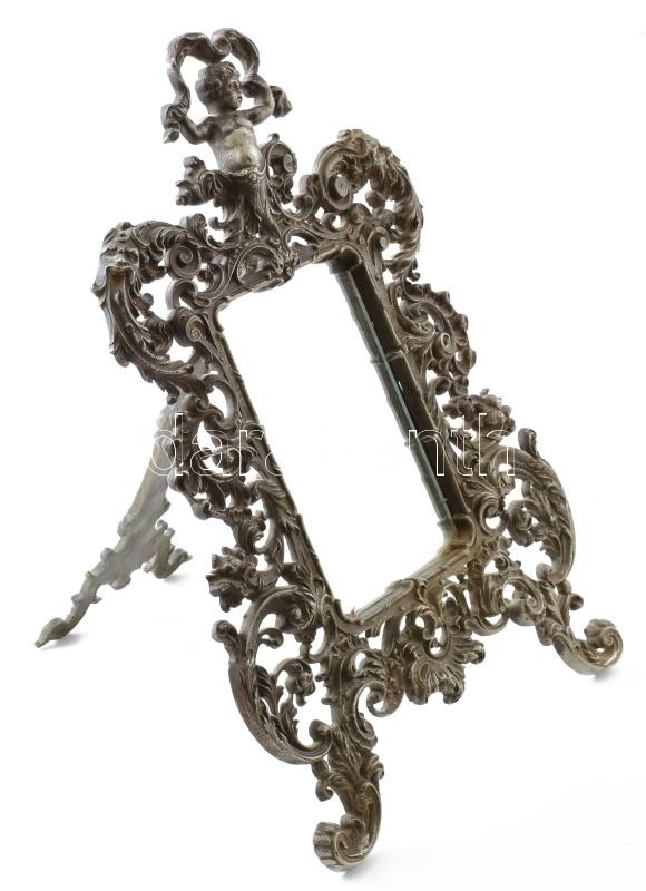 Beschreibung: Szecessziós puttó figurával díszített öntöttvas asztali képtartó / tükör, 45x30 cm