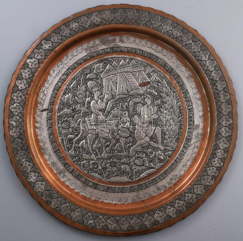 Vadász jelenetet ábrázoló, keleti mintás tál. Kézzel készített, kalapá... https://www.darabanth.com/de/472-Fernauktion/472.0/Kunst-Dokumente-andere-Sammelgebiete/Antik~1000009/Vadasz-jelenetet-abrazolo-keleti-mintas-tal-Kezzel-keszitett-kalapalt-festett-on-fal~II3198997
