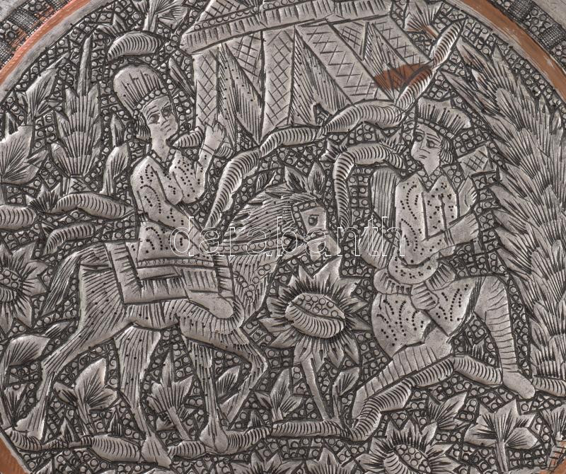 Beschreibung: Vadász jelenetet ábrázoló, keleti mintás tál. Kézzel készített, kalapált, festett, ón fali dísz d: 39 cm