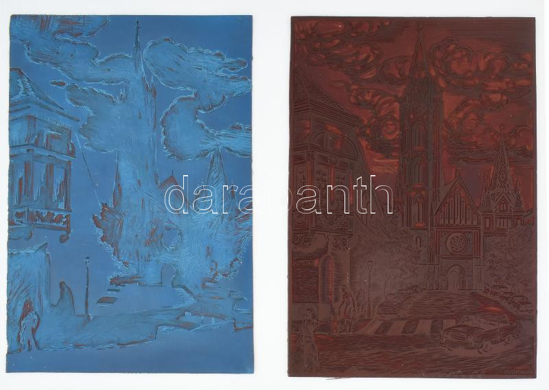 Varga Mátyás (1910-2002) grafikus, díszlettervező által készített linóleumdúc a Mátyás templom c. grafikájához. Jelzett a dúcon. Varga Máytás által feliratozott, szakadt borítékban. 50x35,5 cm.
