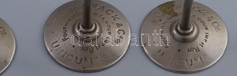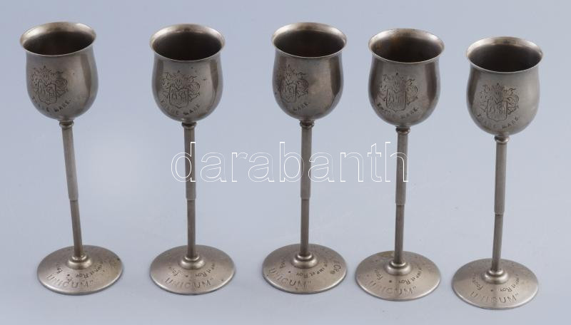 cca 1890, J. Zwack & Co. Unicum 5 darab fém likőrös pohár. Talpon a "fournisseurs de la cour imp. et Roy (a Királyi család hivatalos beszállítója)" felirattal. Címerábrázolással, m: 14,5 cm