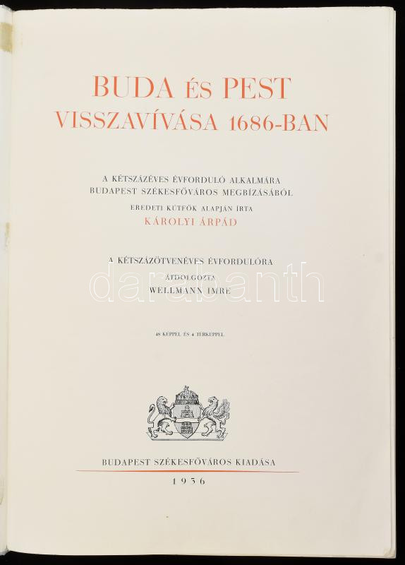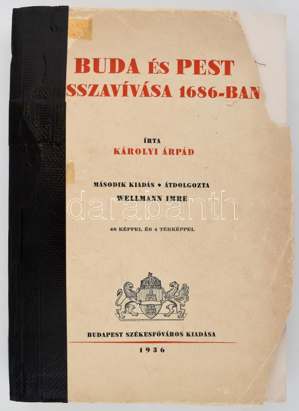 Károlyi Árpád: Buda és Pest visszavívása 1686-ban. A kétszázados emlékünnepély alkalmára Budapest fővárosa megbízásából eredeti kútfők alapján írta - -. A kétszázötvenéves évfordulóra átdolgozta: Wellmann Imre. Bp.,1936., Budapest Székesfőváros, XIX+3+406 p.+6 (kihajtható képtáblák)+4 (kihajtható térkép) t. Fekete-fehér egészoldalas képtáblákkal. Kiadói papírkötés, amatőr módon javított kötéssel és gerinccel, az elülső borítón hiánnyal, egy kihajtható tábla ketté szakadt, a lapok felső szélein kis sérülésekkel (eredetileg felvágatlan példány lehetett és felvágták.)