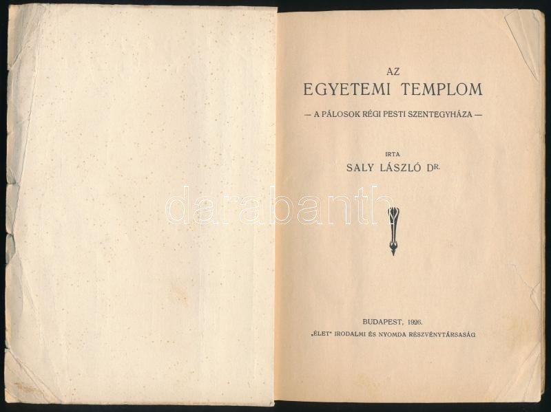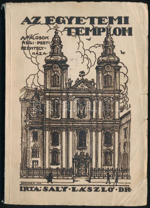 Saly László: Az egyetemi templom. A Pálosok régi pesti szentegyháza. Bp., 1926, "Élet", 83+3 p.+21 (fekete-fehér fotók) t. A borító Márton Lajos munkája. Kiadói papírkötés, foltos, szakadt borítóval.