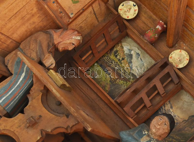Beschreibung: Régi esztergált svájci "3D" falikép, nem működő zeneszerkezettel, 23x37 cm