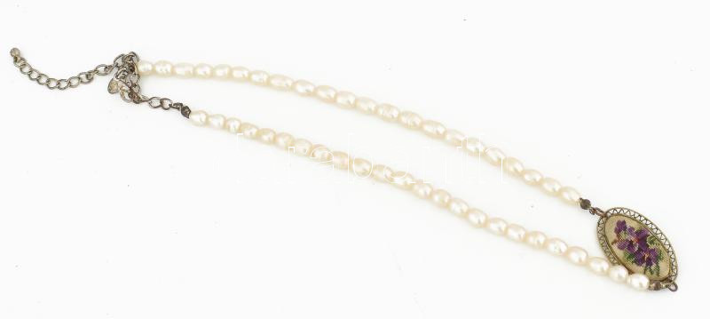 Beschreibung: Tenyésztett gyöngy nyaklánc, goblein berakásos medállal