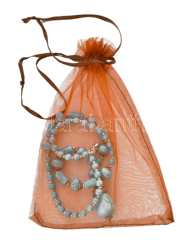 Beschreibung: Türkiz nyakék orientális stílusban, h: 45 cm + függő, dísztasakban