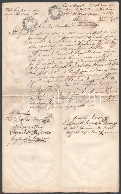 Beschreibung: 1853 Gönc, csereszerződés földügyben, többek között a polgármester aláírásával 10 kr szignettával