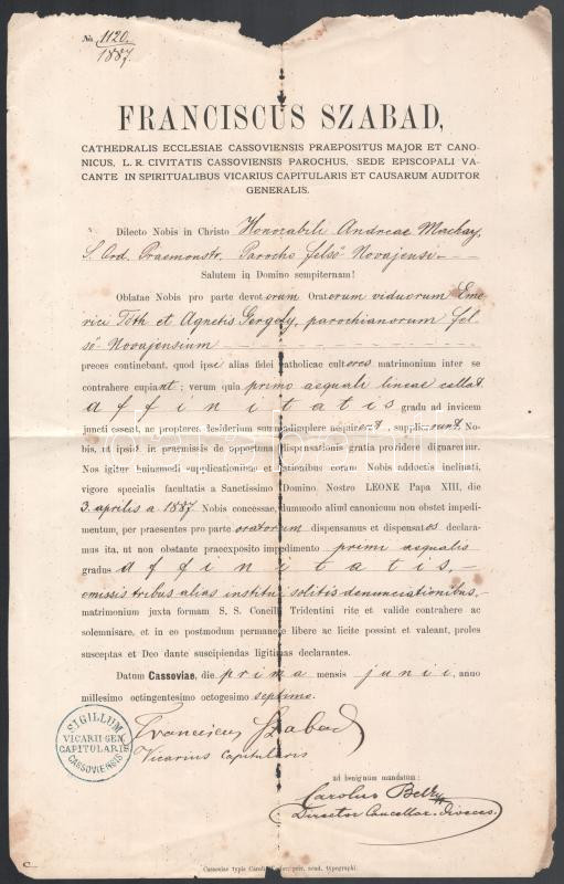 1887 Szabad Ferenc (1814 - 1899 után?) kassai nagyprépost. aláírása eg... https://www.darabanth.com/de/472-Fernauktion/472.0/Kunst-Dokumente-andere-Sammelgebiete/Dokument~1000021/1887-Szabad-Ferenc-1814-1899-utan-kassai-nagyprepost-alairasa-egyhazi-okiraton-szakada~II3195445