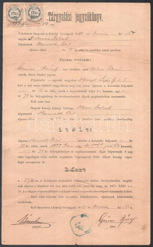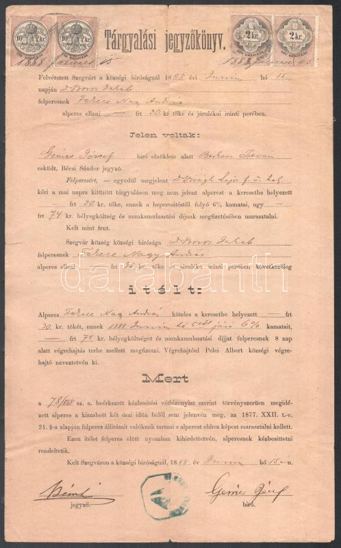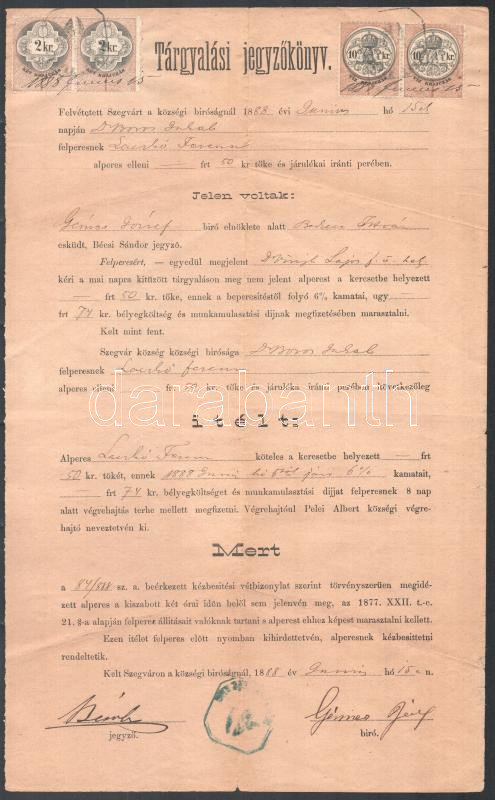 1888, 3 darab Tárgyalási jegyzőkönyv, Szegvár, illetékbélyeggel https://www.darabanth.com/de/472-Fernauktion/472.0/Kunst-Dokumente-andere-Sammelgebiete/Dokument~1000021/1888-3-darab-Targyalasi-jegyzokonyv-Szegvar-illetekbelyeggel~II3198587