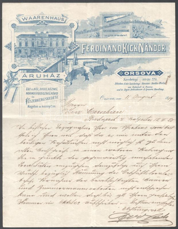 1899 Orsova, Kick Nándor Áruhzának fejléces levélpapírja https://www.darabanth.com/de/472-Fernauktion/472.0/Kunst-Dokumente-andere-Sammelgebiete/Dokument~1000021/1899-Orsova-Kick-Nandor-Aruhzanak-fejleces-levelpapirja~II3199932