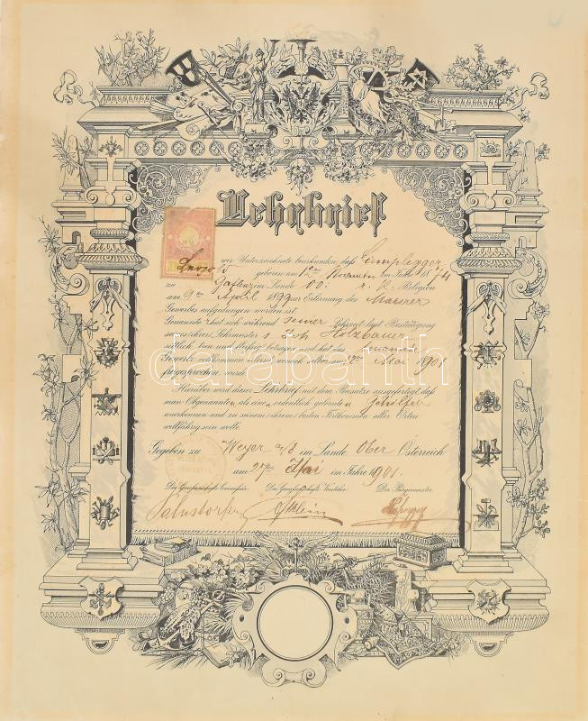 1901 Weyer, Díszes osztrák kőműves mesterlevél, 42x34 cm. https://www.darabanth.com/de/472-Fernauktion/472.0/Kunst-Dokumente-andere-Sammelgebiete/Dokument~1000021/1901-Weyer-Diszes-osztrak-komuves-mesterlevel-42x34-cm~II3195341