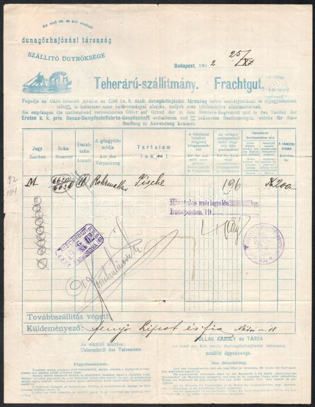 1902 DDSG Dunagőzhajózási társaság hajós fuvarlevél Pancsova. / 1902 D... https://www.darabanth.com/de/472-Fernauktion/472.0/Kunst-Dokumente-andere-Sammelgebiete/Dokument~1000021/1902-DDSG-Dunagozhajozasi-tarsasag-hajos-fuvarlevel-Pancsova-1902-DDSG-Danube-Steam-Shippi~II3092862
