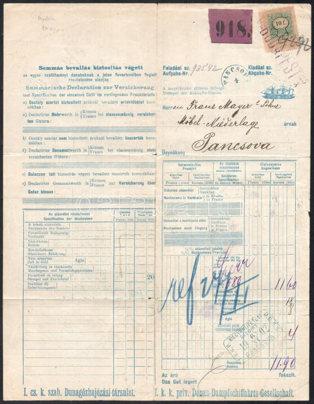 Beschreibung: 1902 DDSG Dunagőzhajózási társaság hajós fuvarlevél Pancsova. / 1902 DDSG Danube Steam Shipping Company ship waybill Pancova.