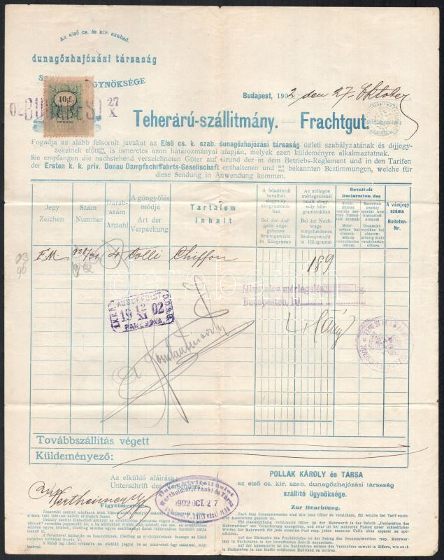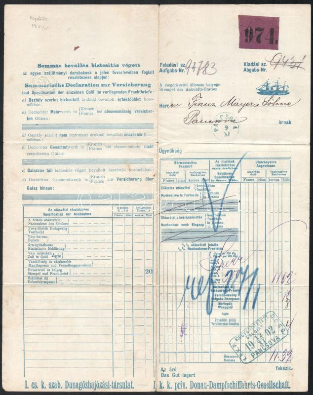 1902 DDSG Dunagőzhajózási társaság hajós fuvarlevél Pancsova. / 1902 D... https://www.darabanth.com/de/472-Fernauktion/472.0/Kunst-Dokumente-andere-Sammelgebiete/Dokument~1000021/1902-DDSG-Dunagozhajozasi-tarsasag-hajos-fuvarlevel-Pancsova-1902-DDSG-Danube-Steam-Shippi~II3092866