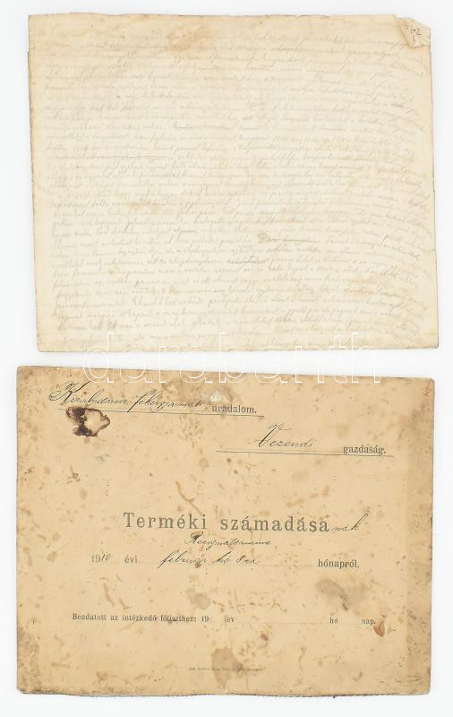 1910-1911 Királydarócz Fehérgyarmati uradalom 2 darab számadási papír,... https://www.darabanth.com/de/472-Fernauktion/472.0/Kunst-Dokumente-andere-Sammelgebiete/Dokument~1000021/1910-1911-Kiralydarocz-Fehergyarmati-uradalom-2-darab-szamadasi-papir-foltos~II3198667