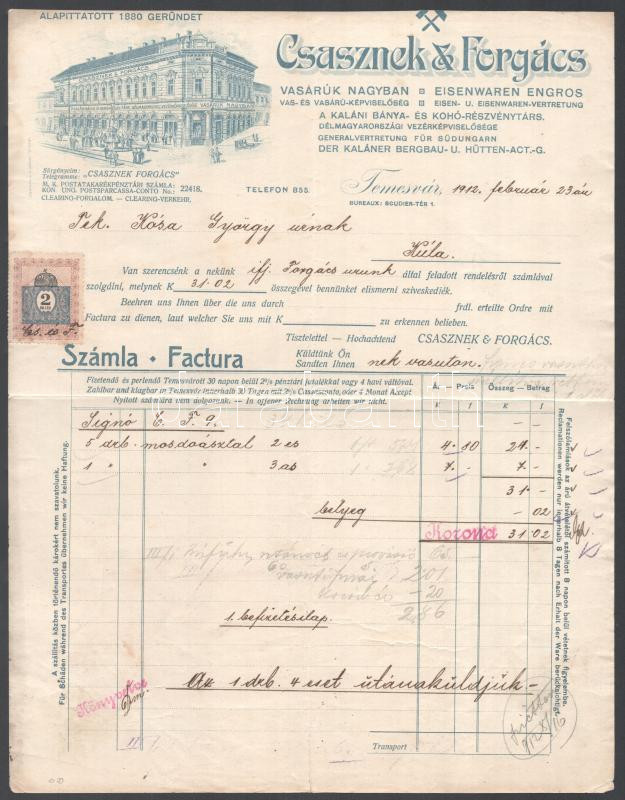 1912 Temesvár, Csasznek és Forgács Vasáruk üzletének fejléces számlája... https://www.darabanth.com/de/472-Fernauktion/472.0/Kunst-Dokumente-andere-Sammelgebiete/Dokument~1000021/1912-Temesvar-Csasznek-es-Forgacs-Vasaruk-uzletenek-fejleces-szamlaja-rajta-az-uzlet-utc~II3200080
