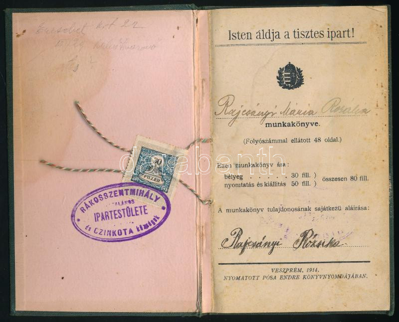 1914 Rajcsányi Mária Rozália varrónő munkakönyve, Rákosszentmihály és Cinkota községek általános ipartestülete által kiállítva, bejegyzésekkel, 30f okmánybélyeggel