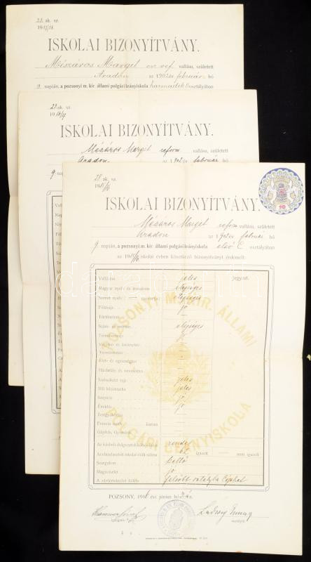 Beschreibung: 1916-1918 Pozsonyi iskolai bizonyítványok