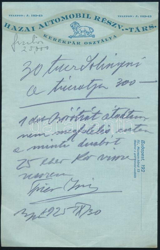 1925 Hazai Automobil Részvénytársaság Kerékpár Osztályának levélpapírj... https://www.darabanth.com/de/472-Fernauktion/472.0/Kunst-Dokumente-andere-Sammelgebiete/Dokument~1000021/1925-Hazai-Automobil-Reszvenytarsasag-Kerekpar-Osztalyanak-levelpapirja~II3199161