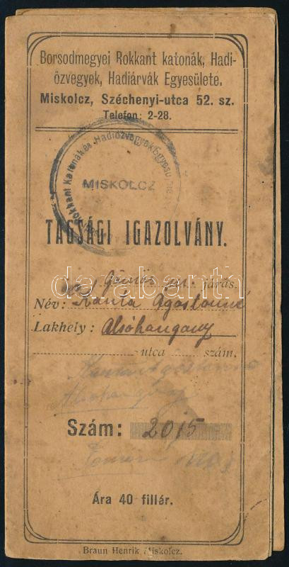 1926 Miskolc, Kanta Ágostonné alsóhangonyi lakos Borsodmegyei Rokkant Katonák, Hadiözvegyek, Hadiárvák Egyesületének tagsági igazolványa, kinyitható, belül A Hadigondozottak Tízparancsolatja és az alapszabályzat, foltos 28,3x14,5 cm