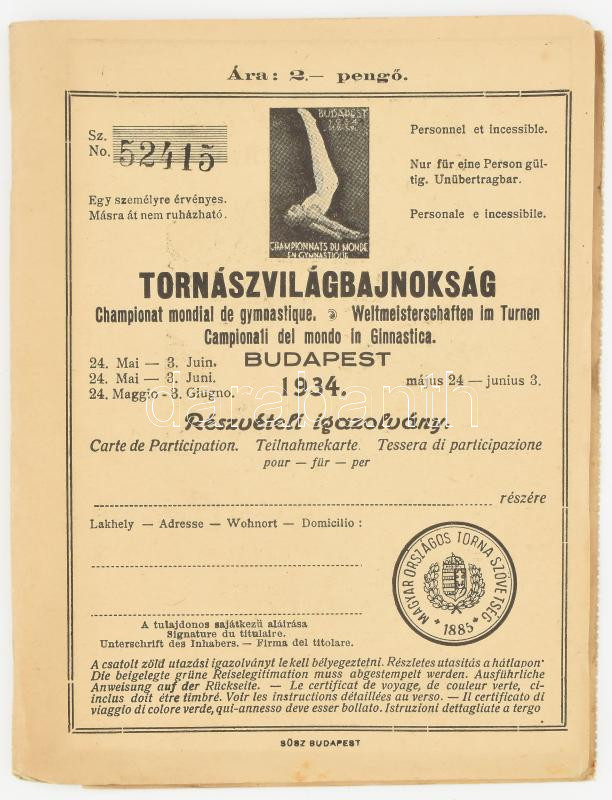 1934 Tornászvilágbajnokság részvételi igazolvány https://www.darabanth.com/de/472-Fernauktion/472.0/Kunst-Dokumente-andere-Sammelgebiete/Dokument~1000021/1934-Tornaszvilagbajnoksag-reszveteli-igazolvany~II3200947